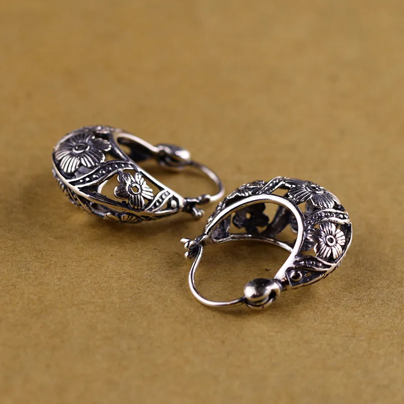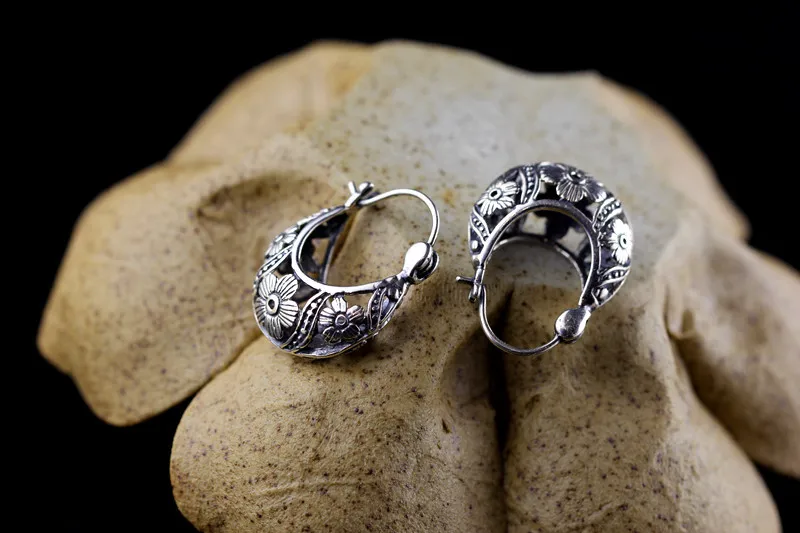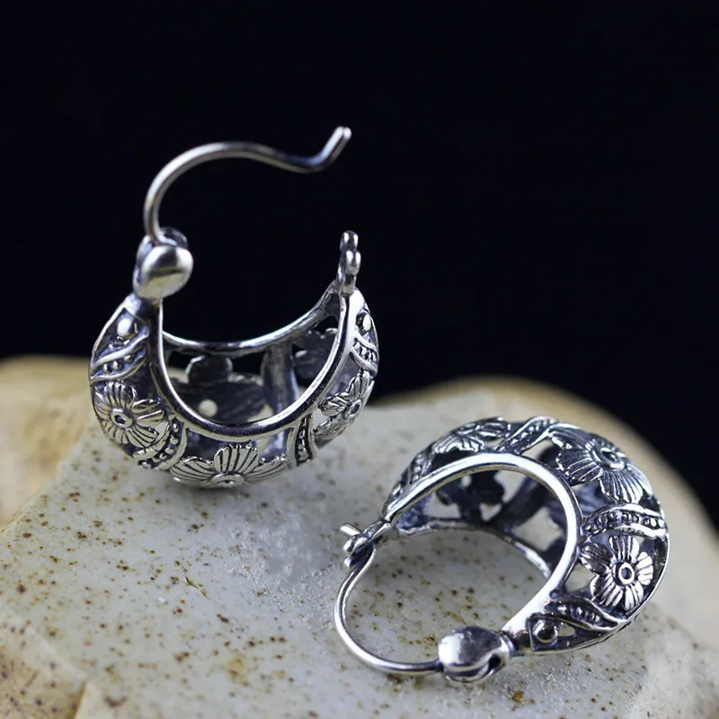 Vintage Drop Earrings 925 Sterling Silver Fine Jewelry Hollow Carving Women's S925 Earring Ethnic Retro Oorbellen Embroidery New