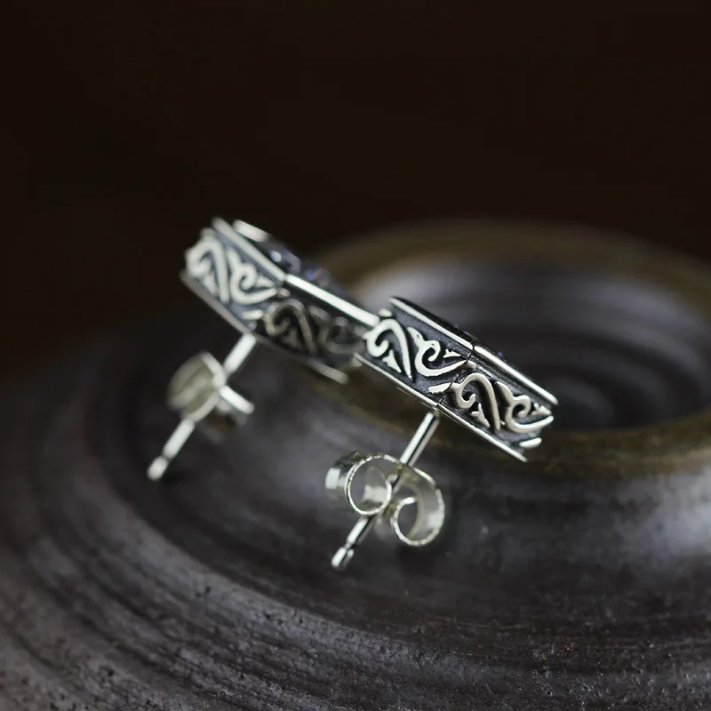 Vintage Flower Square Gamstone Black Agate Zircon Stud Earrings For Women Simple 100% 925 Sterling Silver Men Jewelry SE130