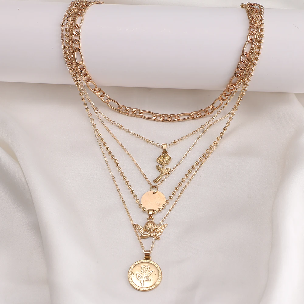 Vintage Multilayer Metal Chain Pendant Necklace for Women Bohemian Gold Coin Flower Angel Collar Pendant Necklace Jewelry Gift