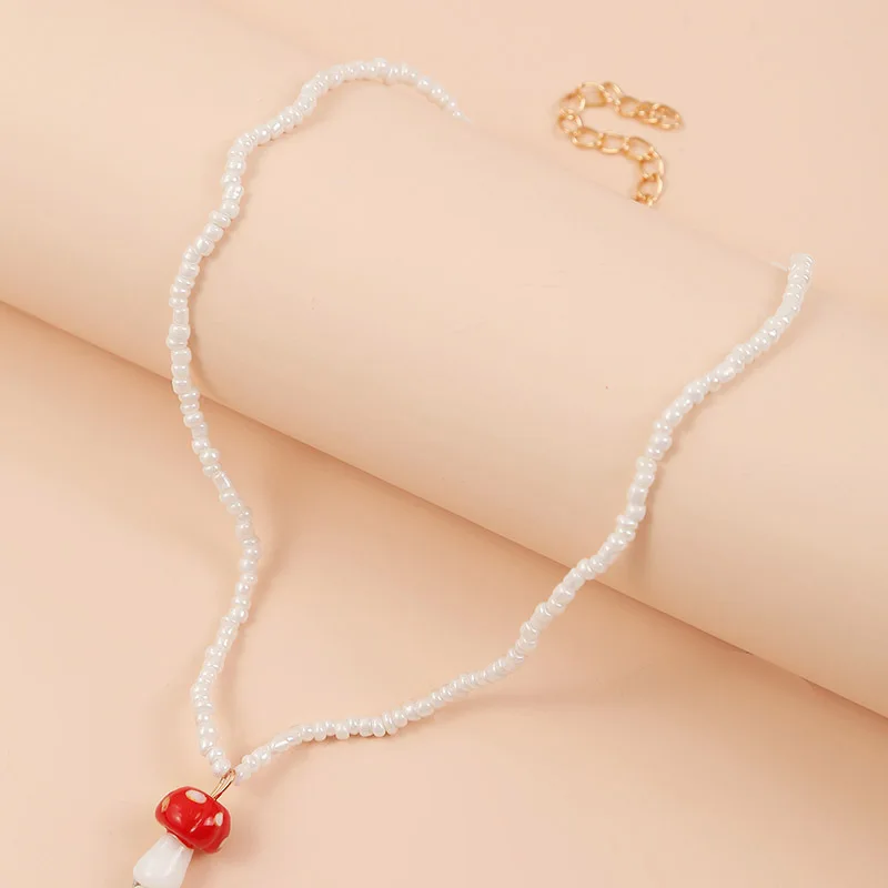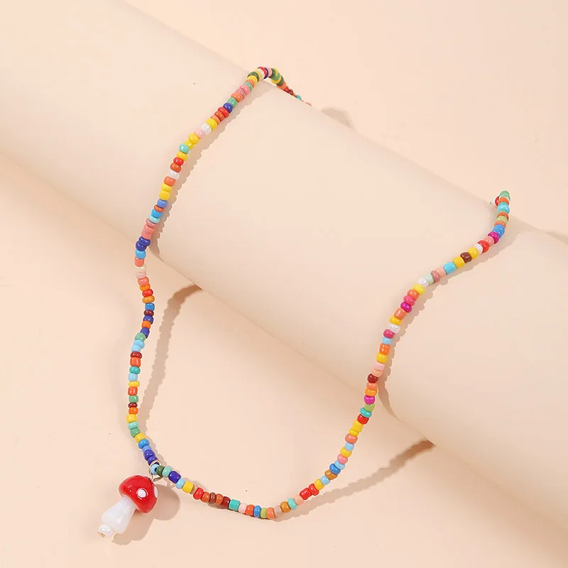 Vintage Seed Beads Chain Necklace for Gilrs Metal Buckle Mushroom Pendant Statement Choker Bulk