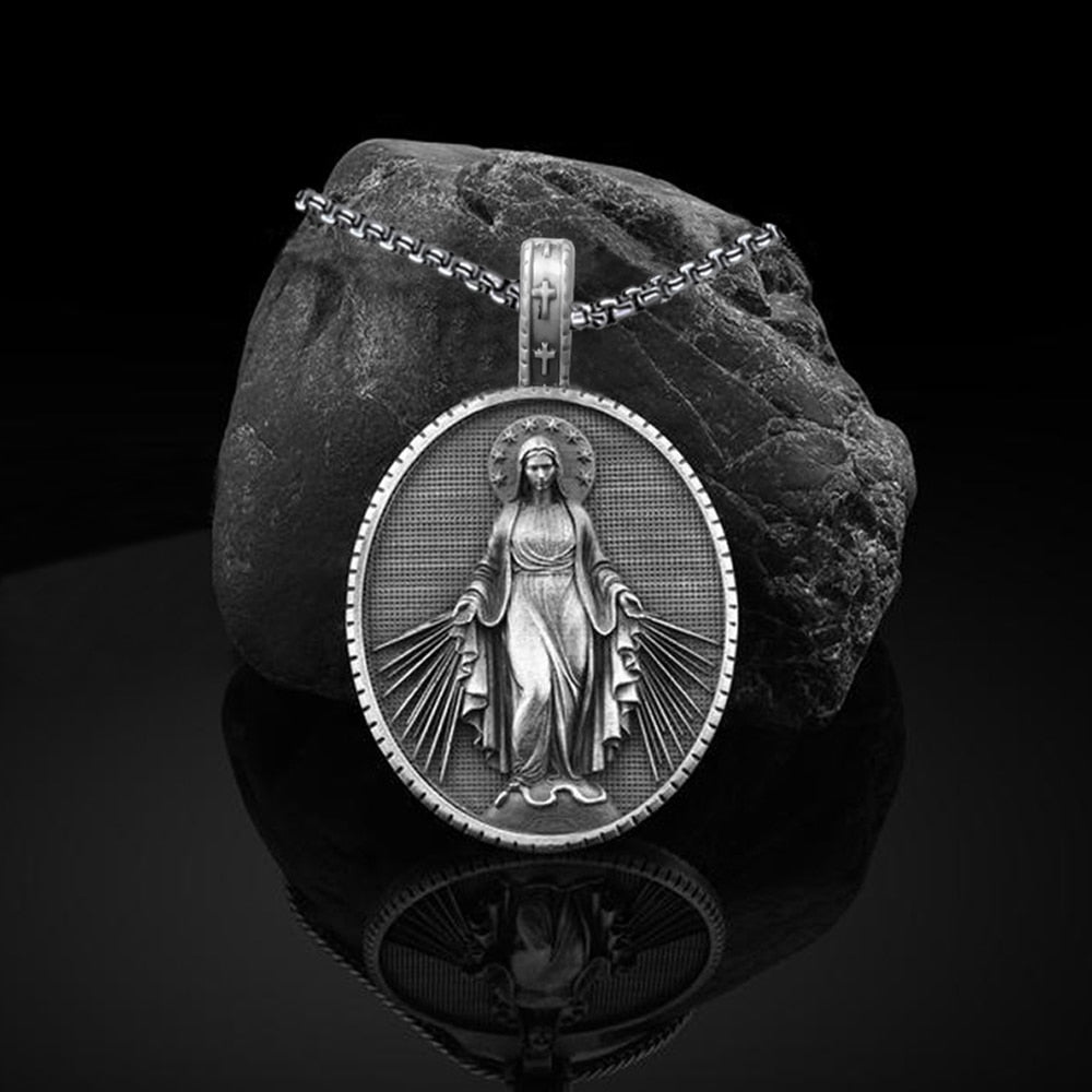 Virgin Mary Commemorative Necklace Badge Religious Christian Stainless Steel Pendant Necklace Catholic Faith Chain Necklace