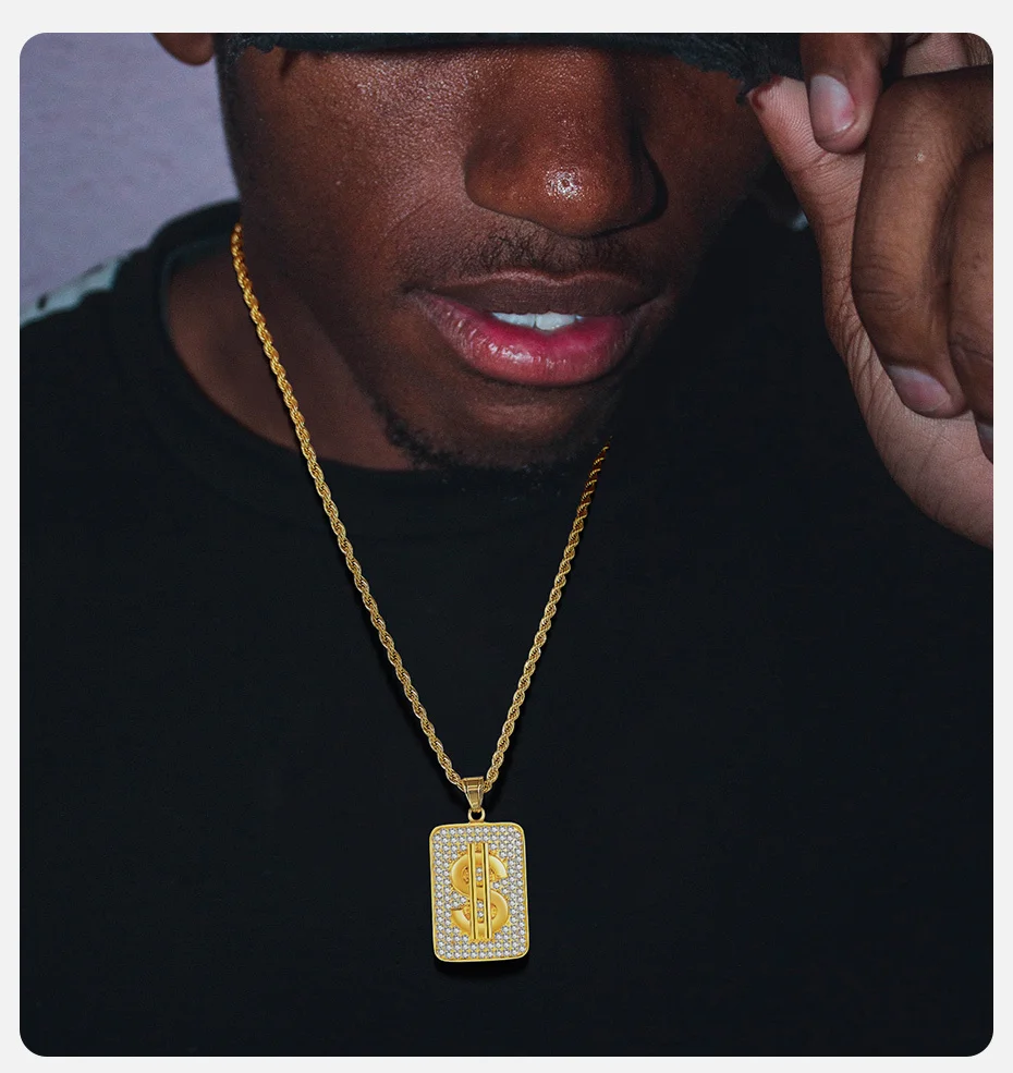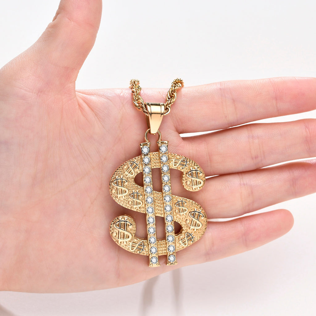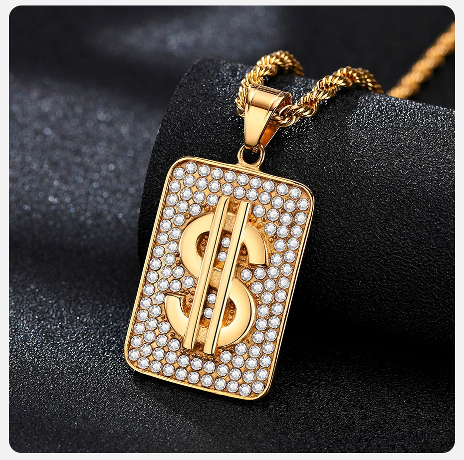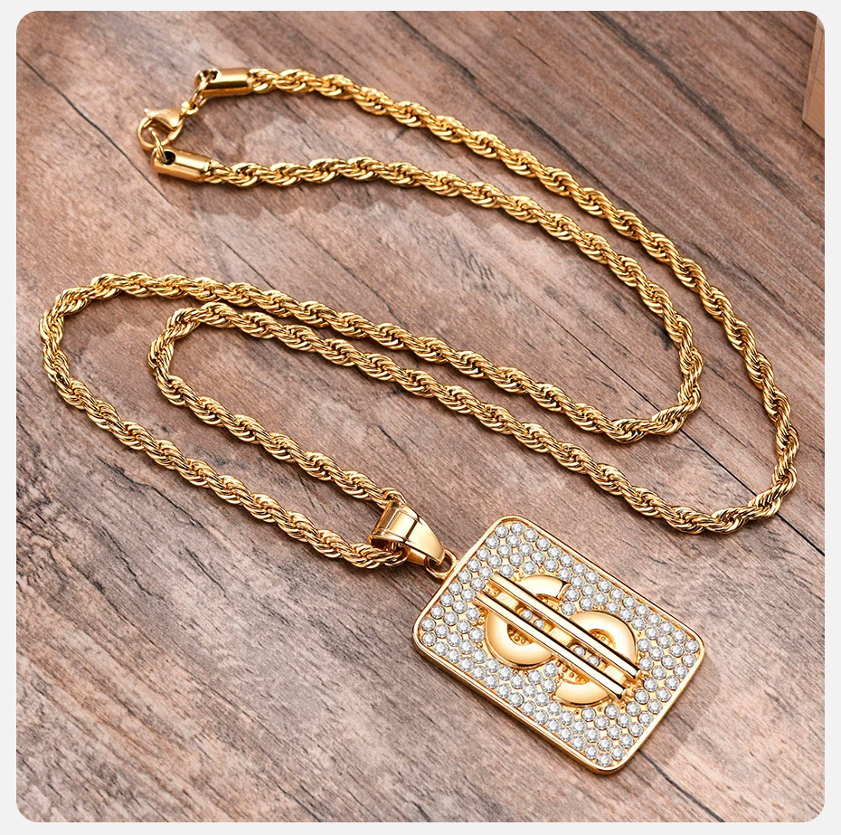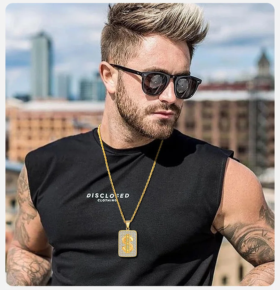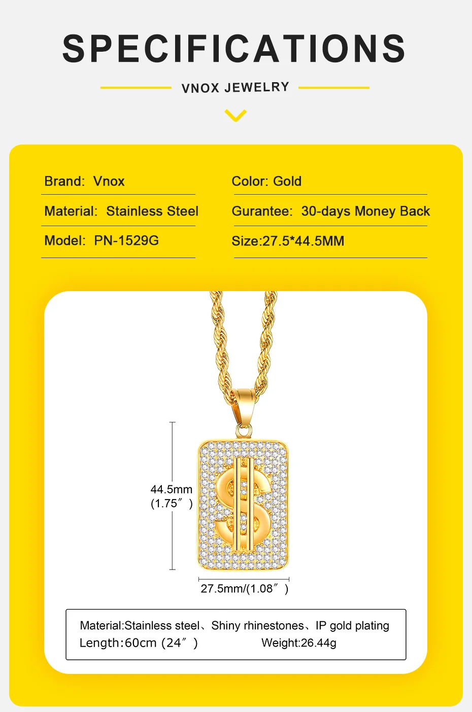 Vnox Heavy Chunky Necklace for Men, Gold Tone Stainless Steel Dollar Pad with Bling AAA CZ Stones Pendant, Punk Rock Boy Jewelry