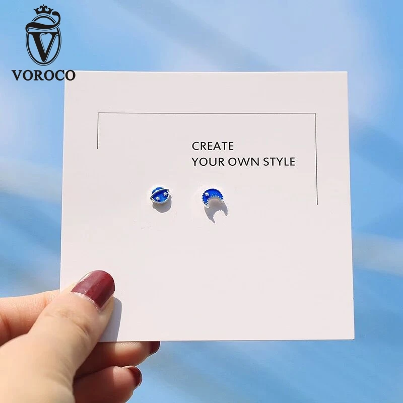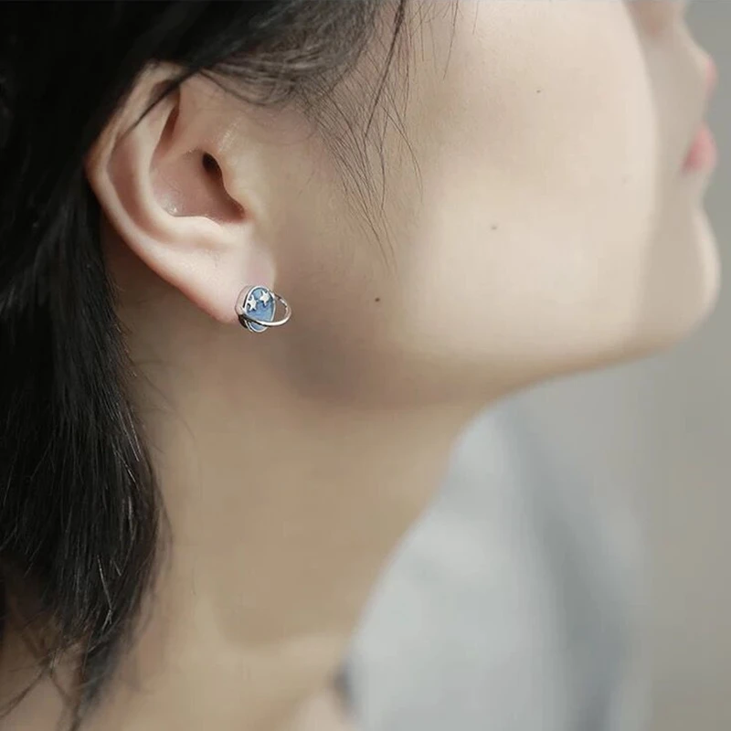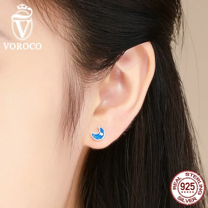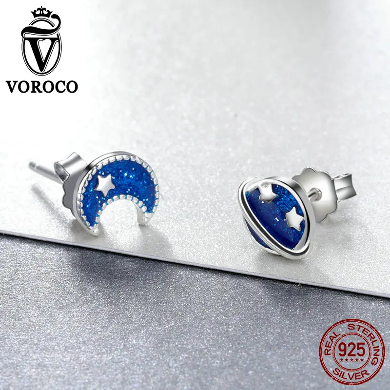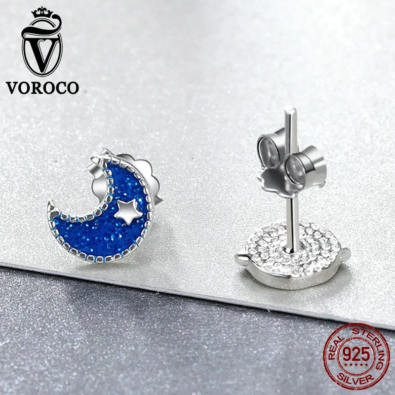 Glitter Blue Moon & Star Galaxy Stud Earrings Party Cute Gift Pure 925 Sterling Silver Fine Jewelry For Women Girl VSE151