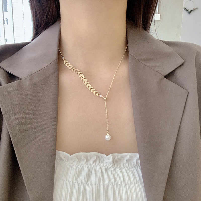 Wheat Spike Pearl Necklace Women Ins simple cool small style design feel temperament light titanium steel chain