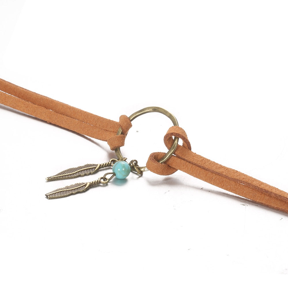 Women Bohemian Choker Boho Feather Bead Pendant Brown Leather Chain Necklace Lady Jewelry Party Gift