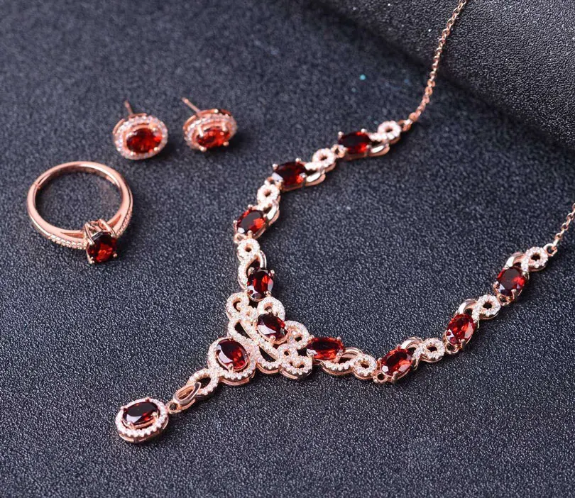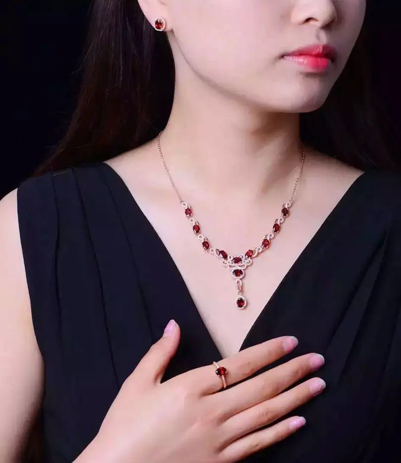 Natural Garnet Gemstone Jewelry Set Genuine 925 Sterling Silver Necklace Pendant Ring Earring lady Sets