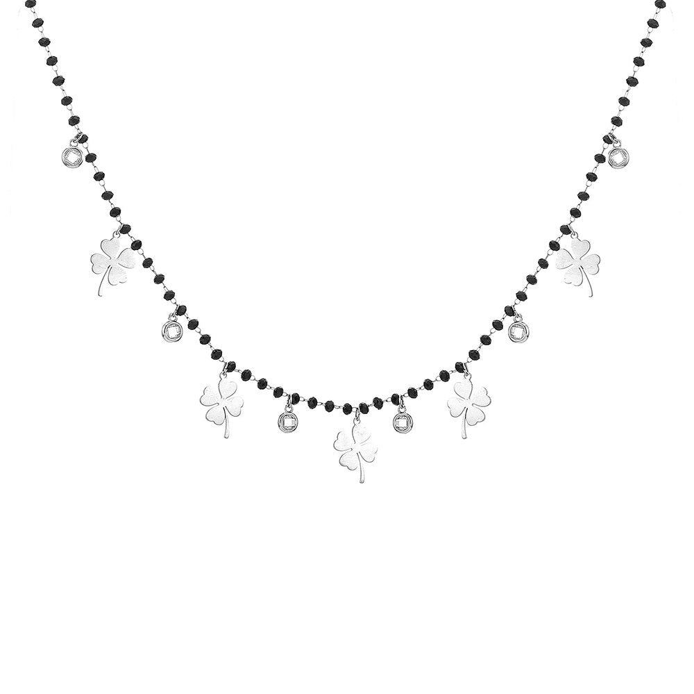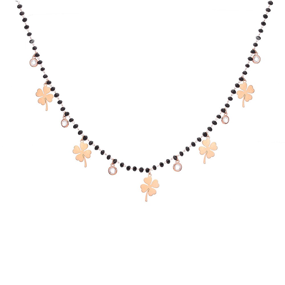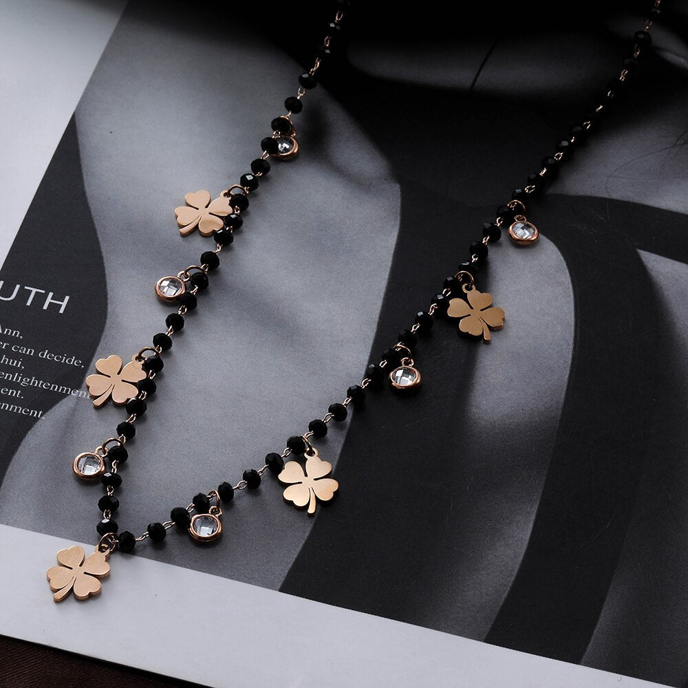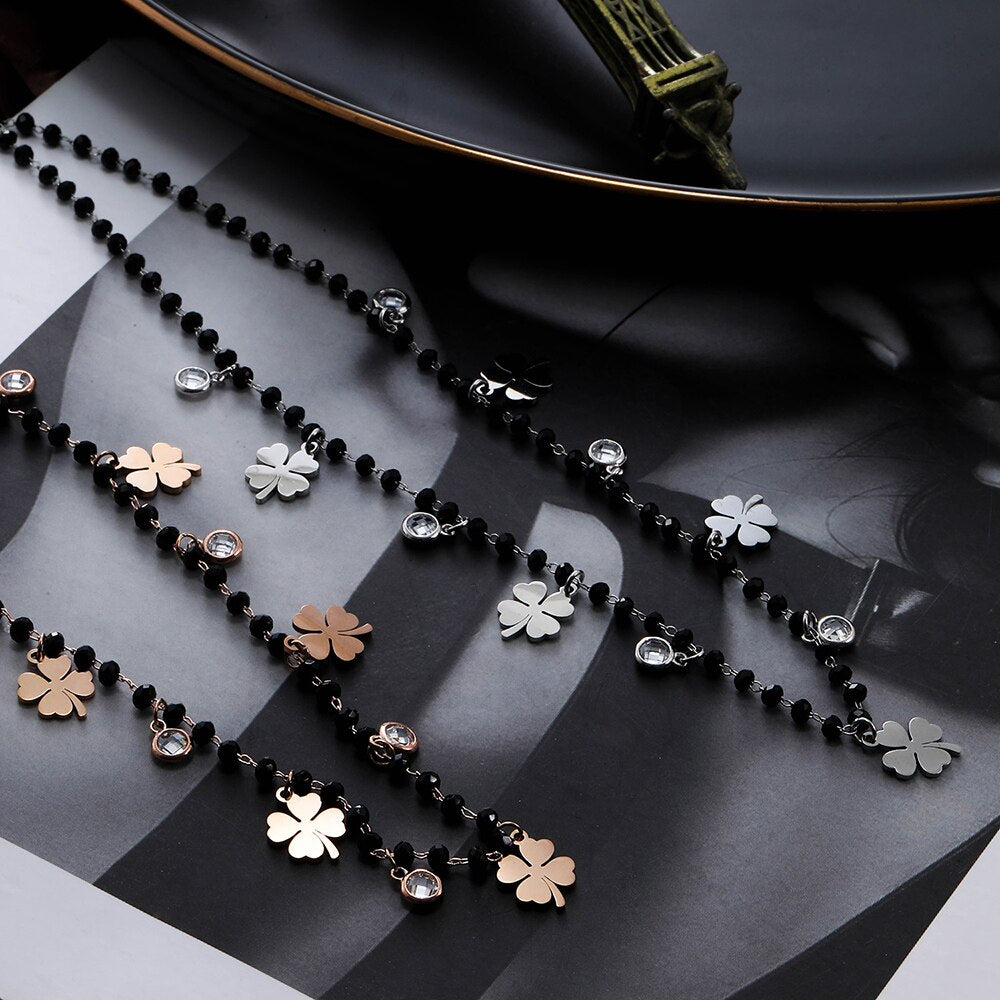 Women's Four Clover Chokers Neckalce Stainless Steel Pendant Black Beads Crystal Chain Necklaces Jewelry Elegant Collier femme