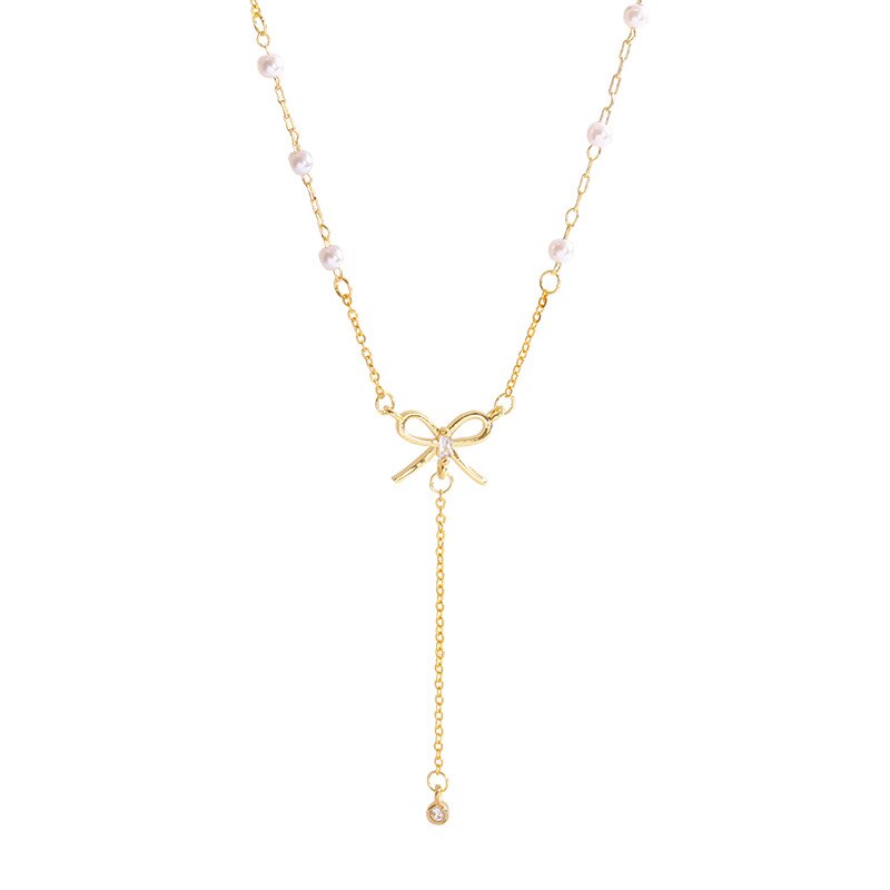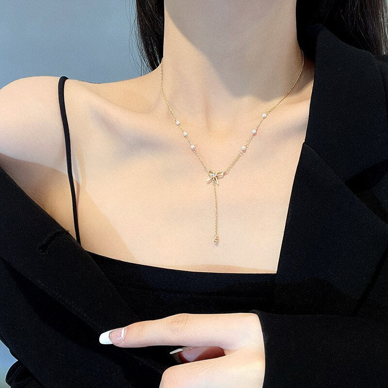 Women's Jewelry Stainless Steel Chain Necklace Gold Bow Long Chain Tassel Choker Necklace Exquisite Clavicle Chain