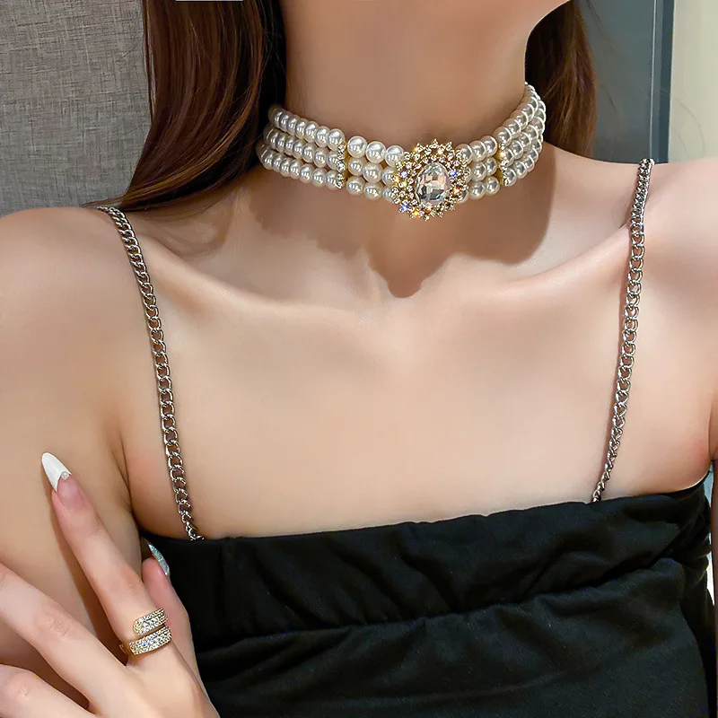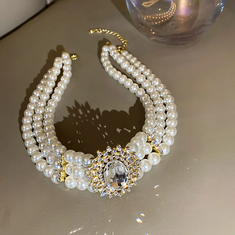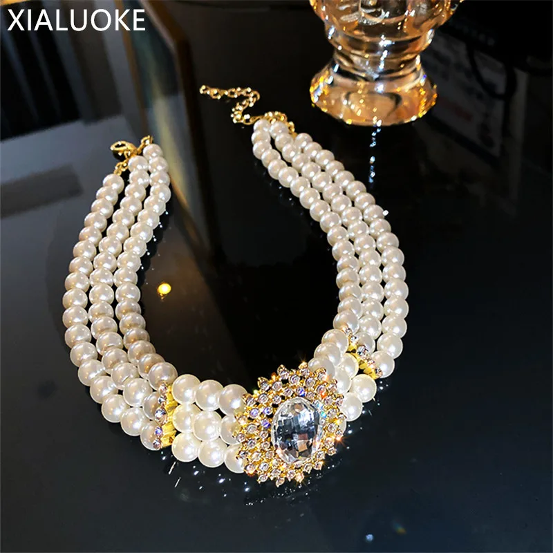 XIALUOKE Three Layer Pearl Crystal Glass Large Choker Necklace For Women Vintage Hyperbole Multilayer Flowers Short Necklaces