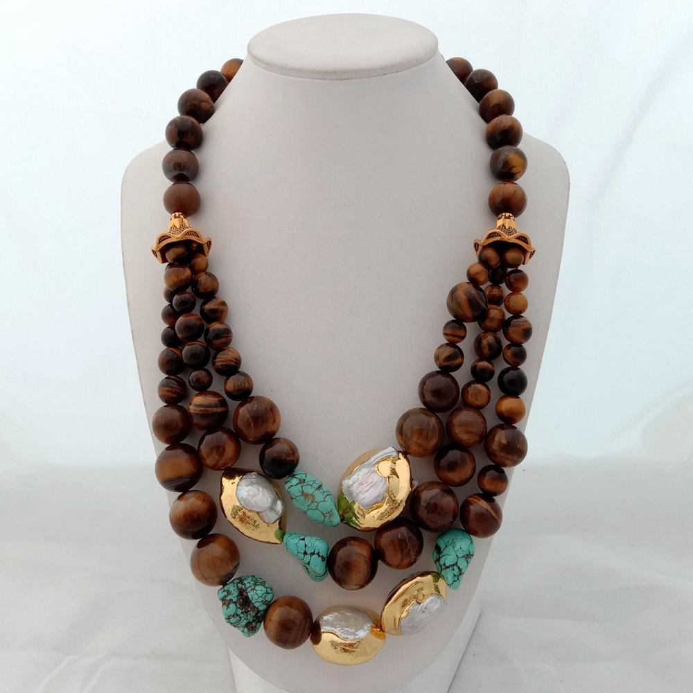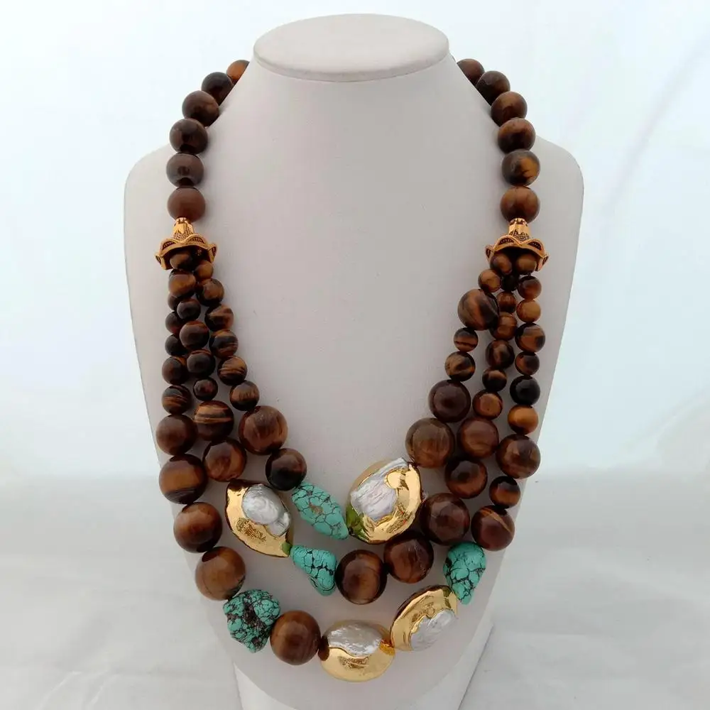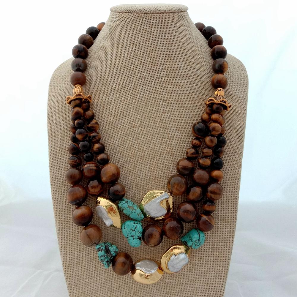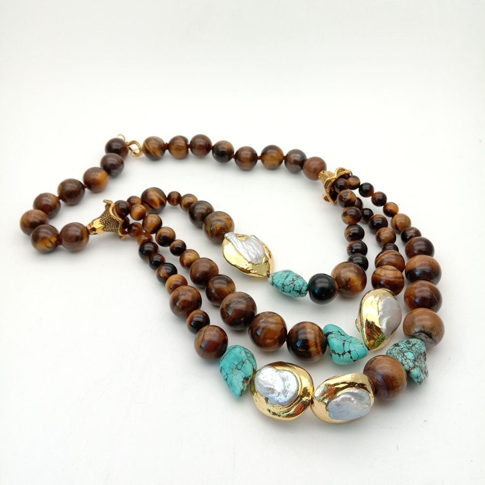 Y·YING 20'' Natural 3 Strands White Keshi Pearl Yellow Tigers Eye Round Turquoise Nugget statement Necklace for women