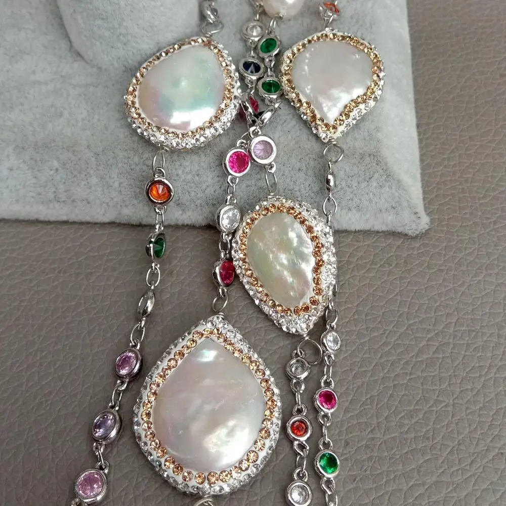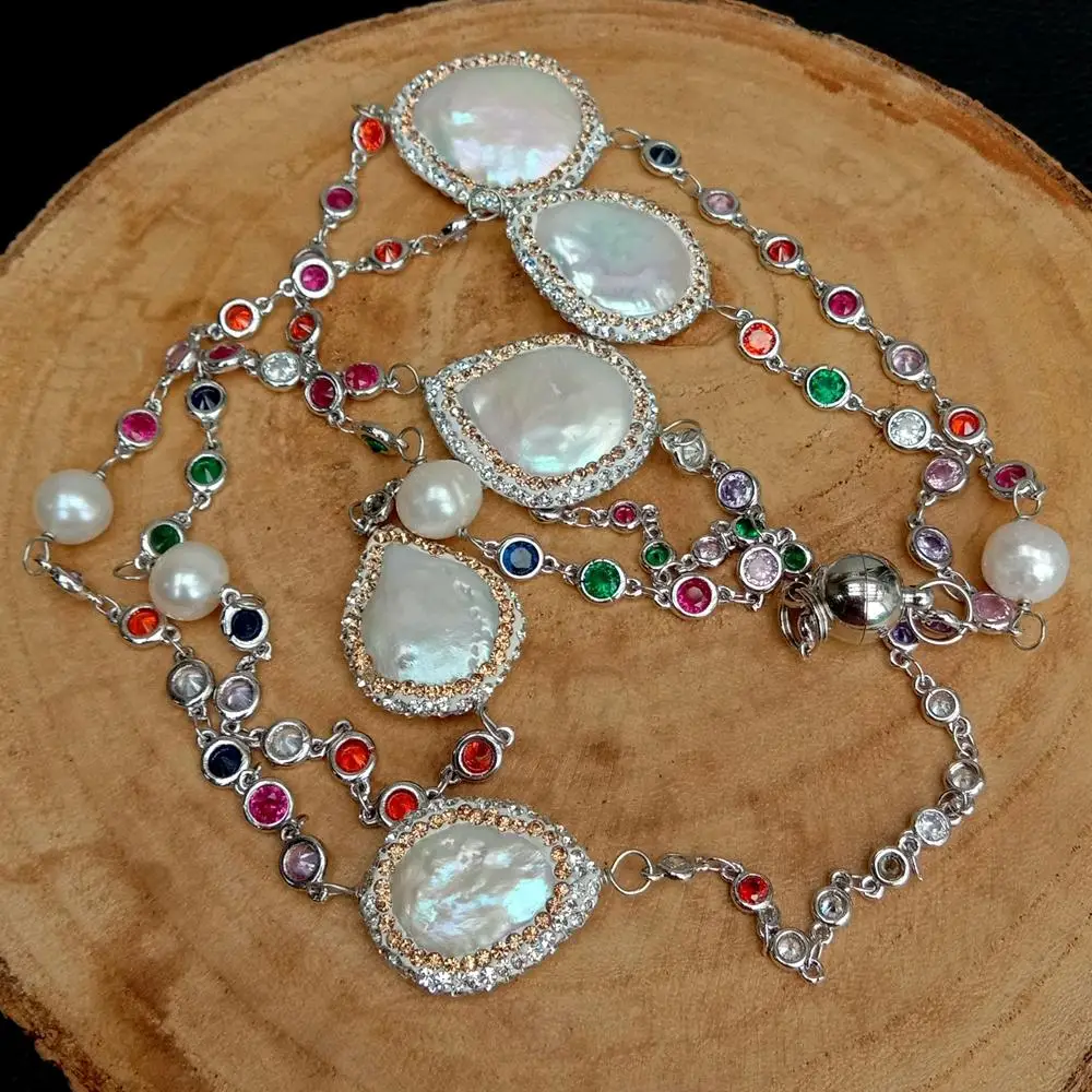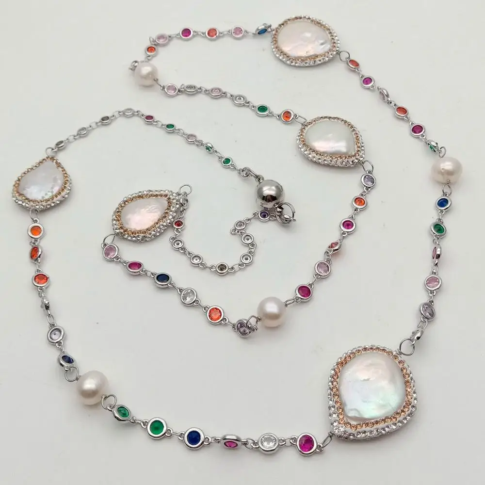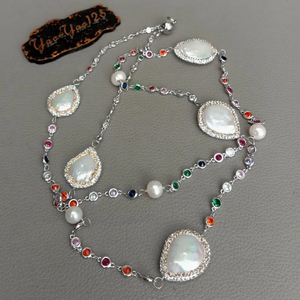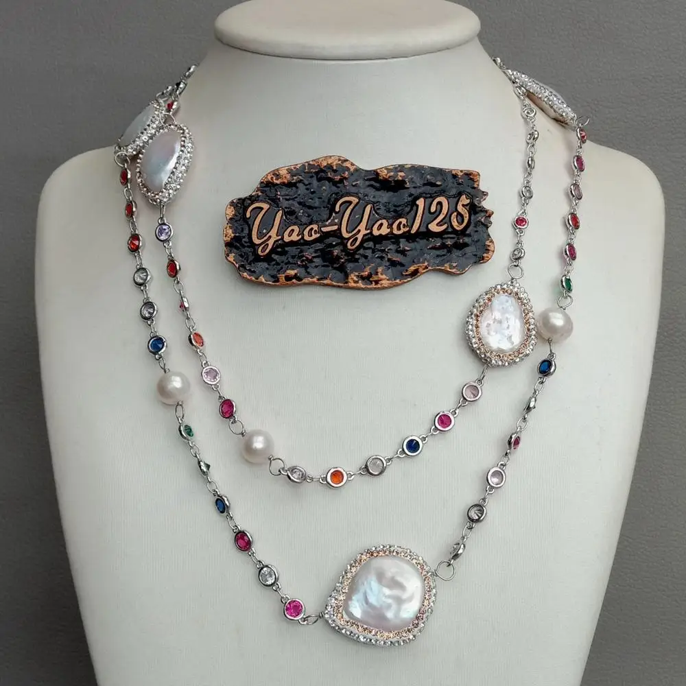 Y·YING 36'' White Coin Pearl Mixed Color Cz pave Chain Long Necklace Trendy Gold Copper Chain For Women Charm Jewelry