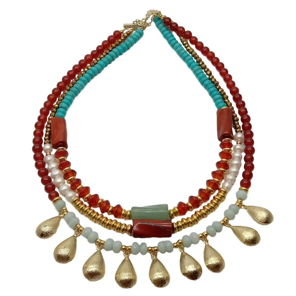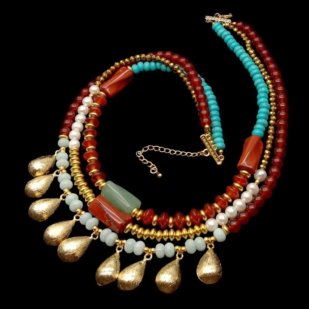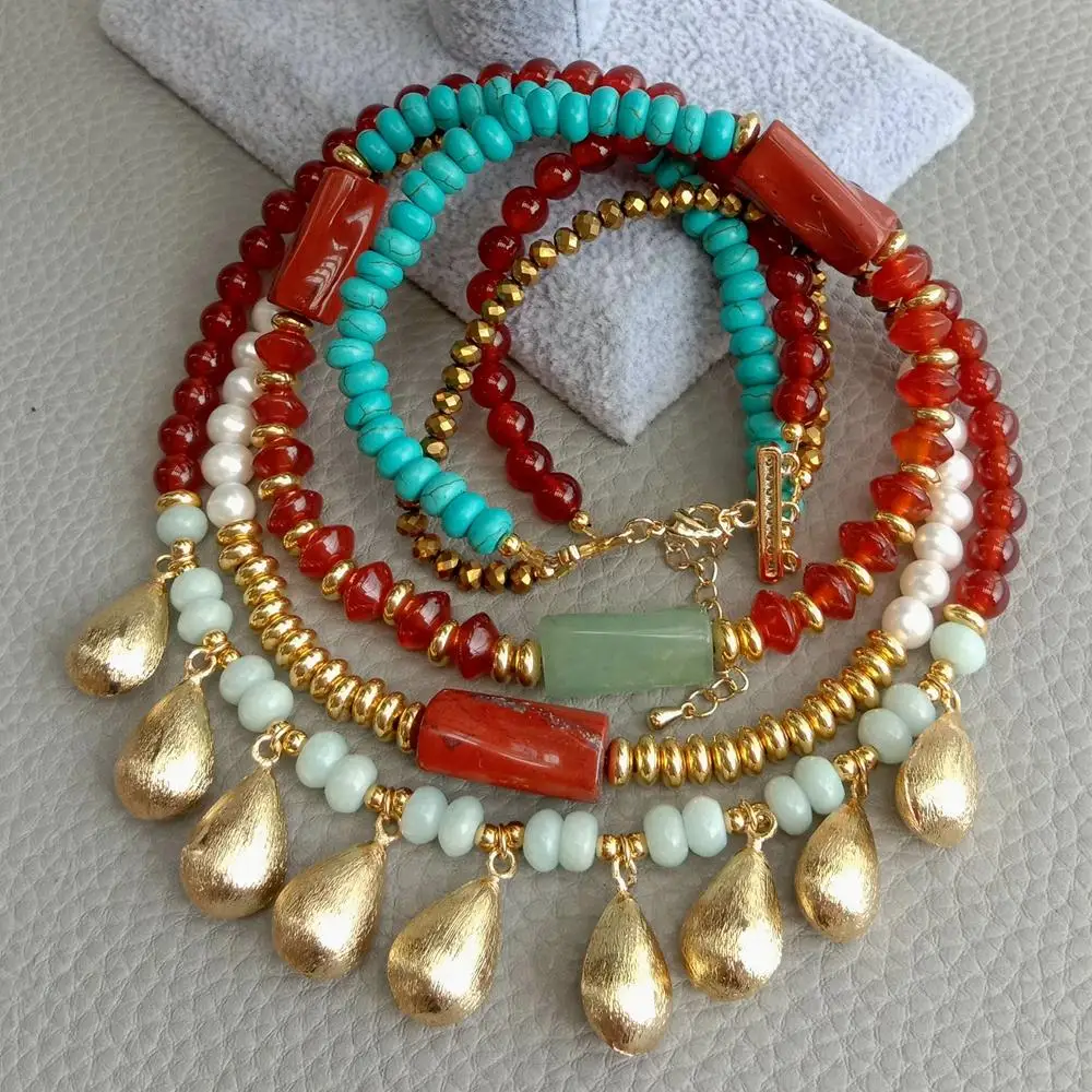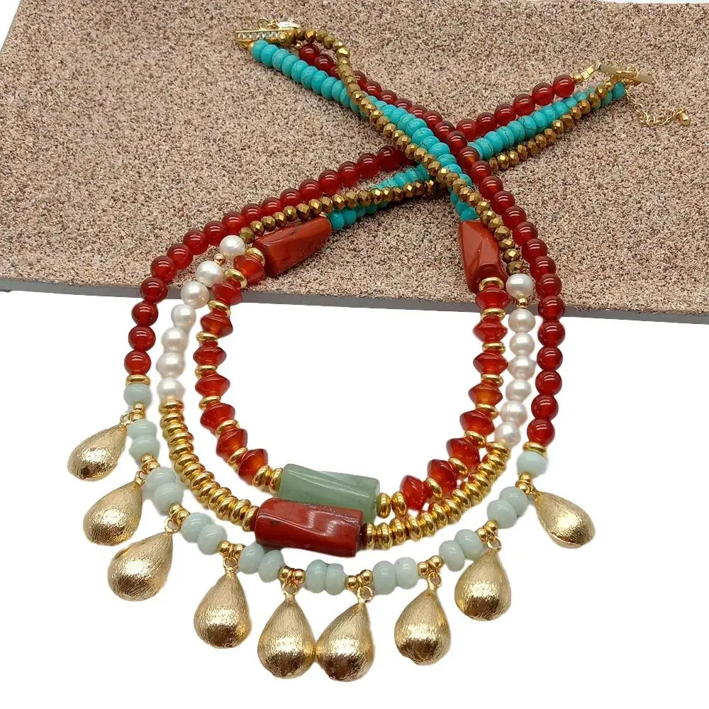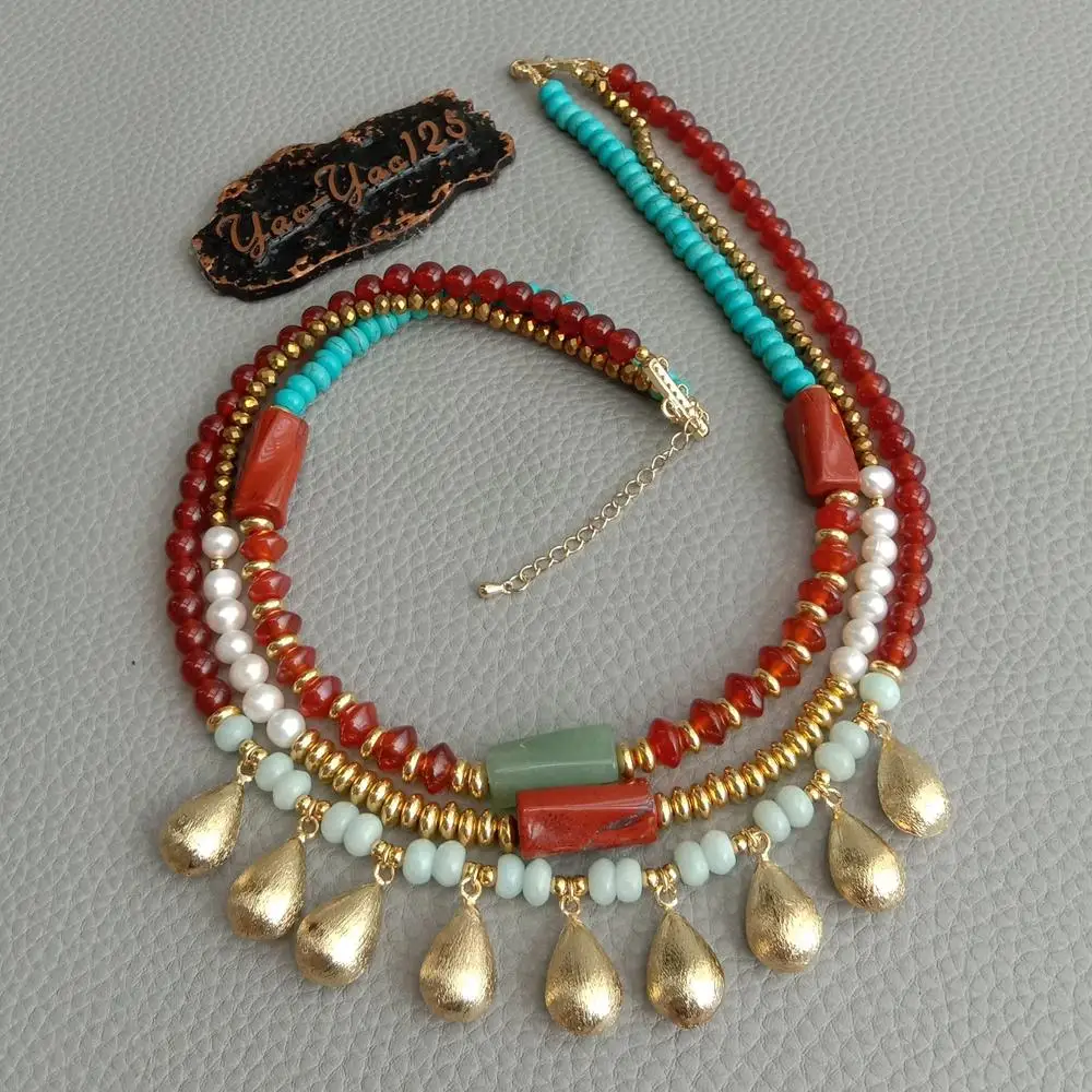 Y·YING Cultured White freshwater Pearl carnelian Amazonite howlite rondelle gold color teardrop beads statement Necklace 17"