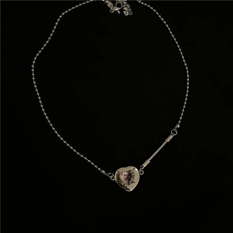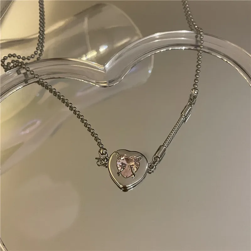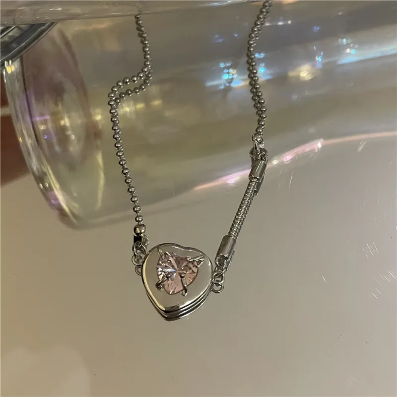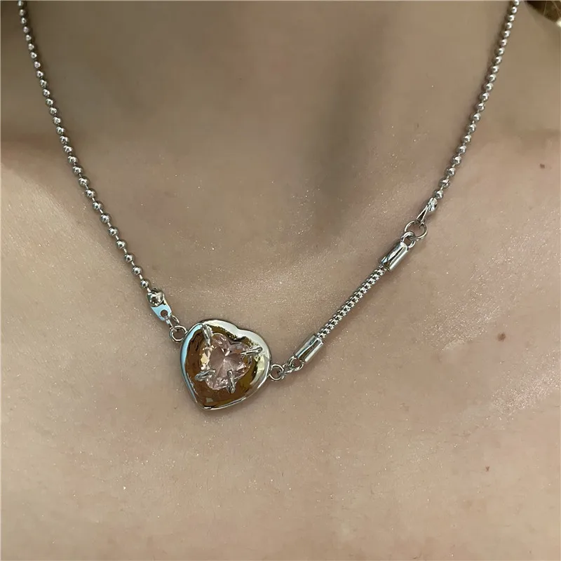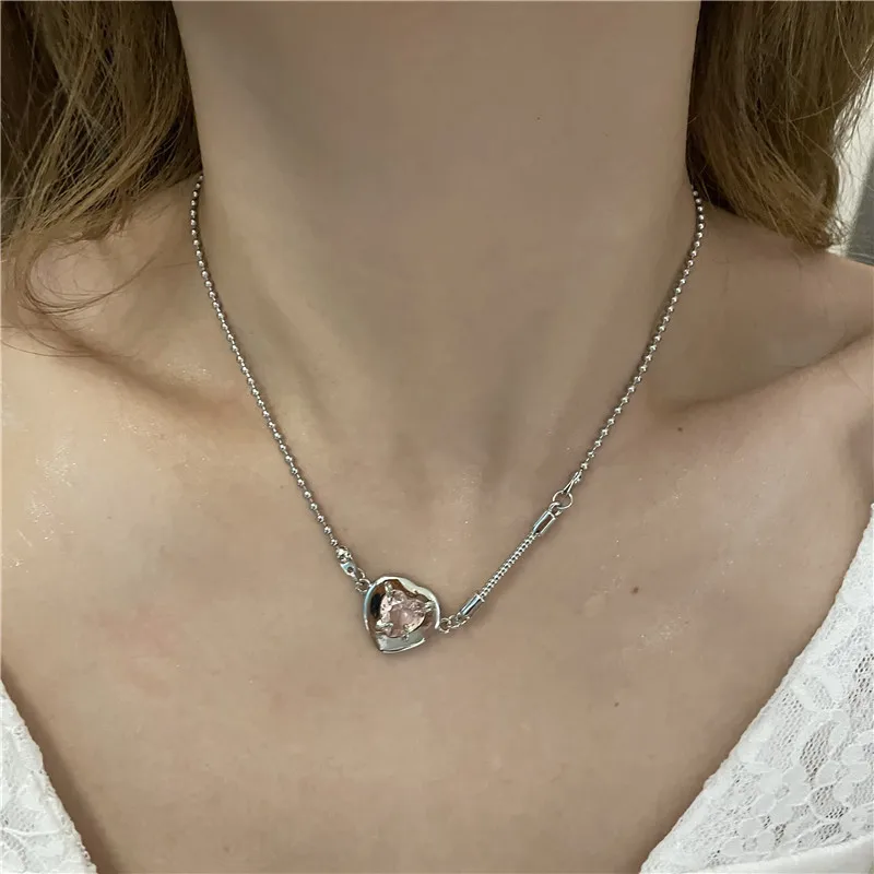 Y2K Crystal Ice Plum Pink Love Heart Pendant Necklace Zinc Alloy Vintage Punk Clavicle Chain Necklace for Women Jewelry Choker