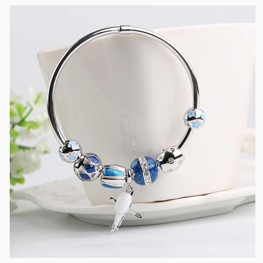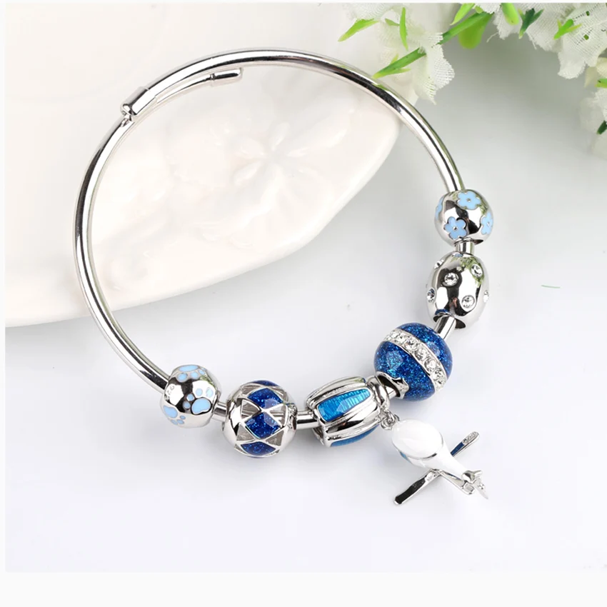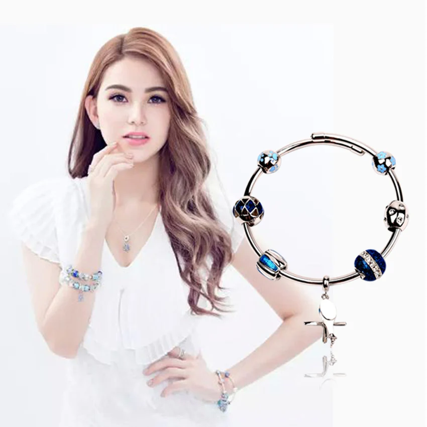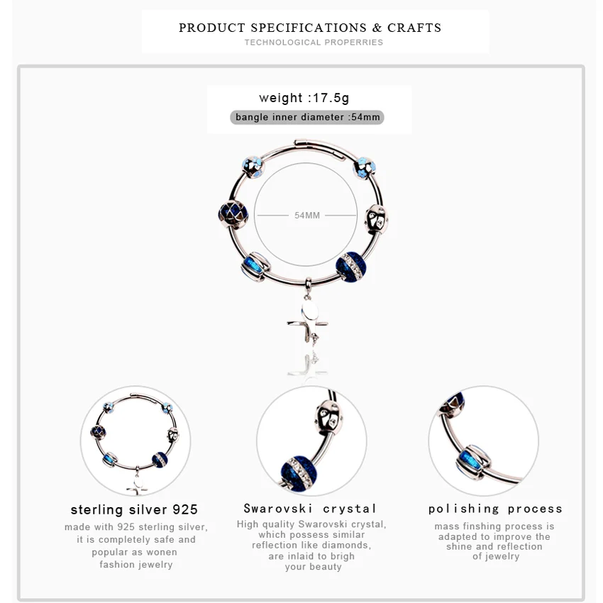 Authentique 925 Sterling Silver Bangle with Swarovski crystal Blue Enamel Bead Bracelet for Women Fashion Jewelry