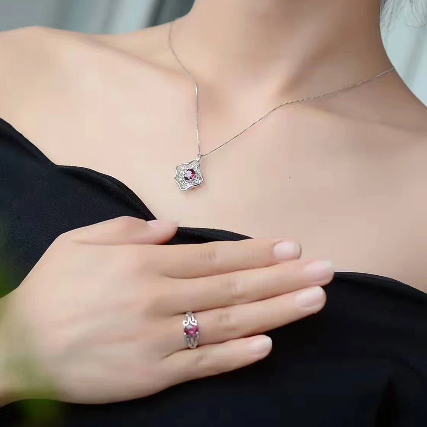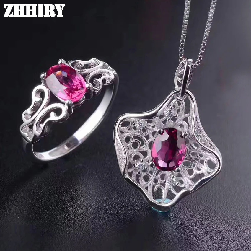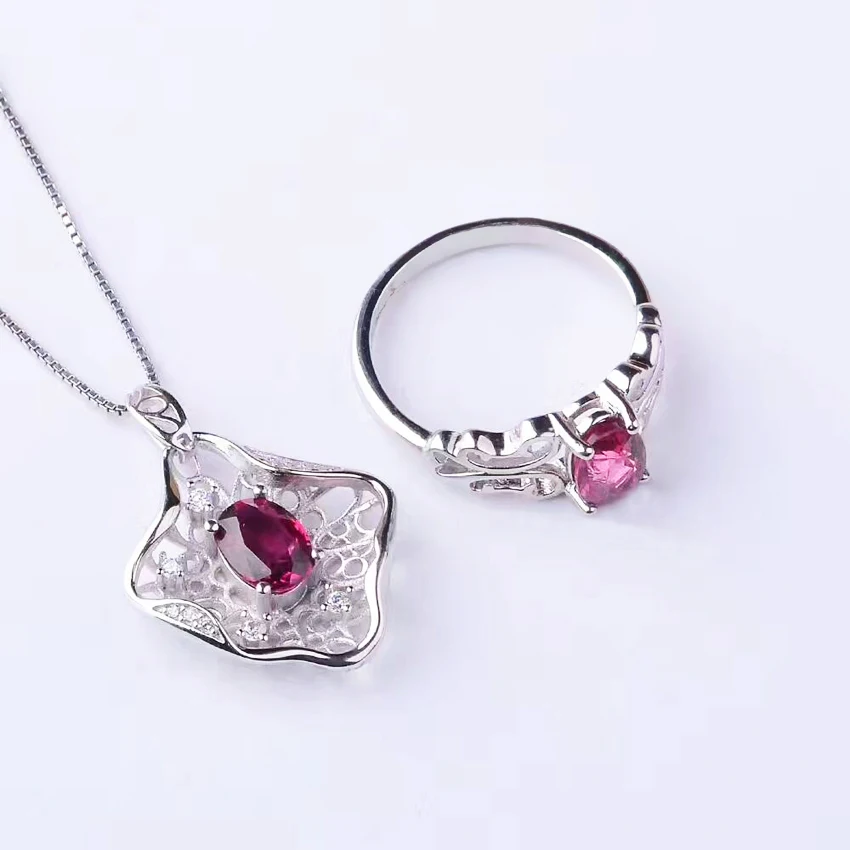 Women Jewelry Sets Natural Pyrope Garnet Gem Stone Genuine 925 Sterling Silver Ring Earring Pendant Chain Fine Jewelry
