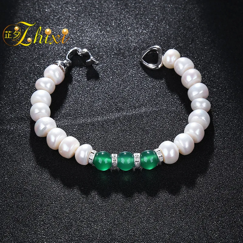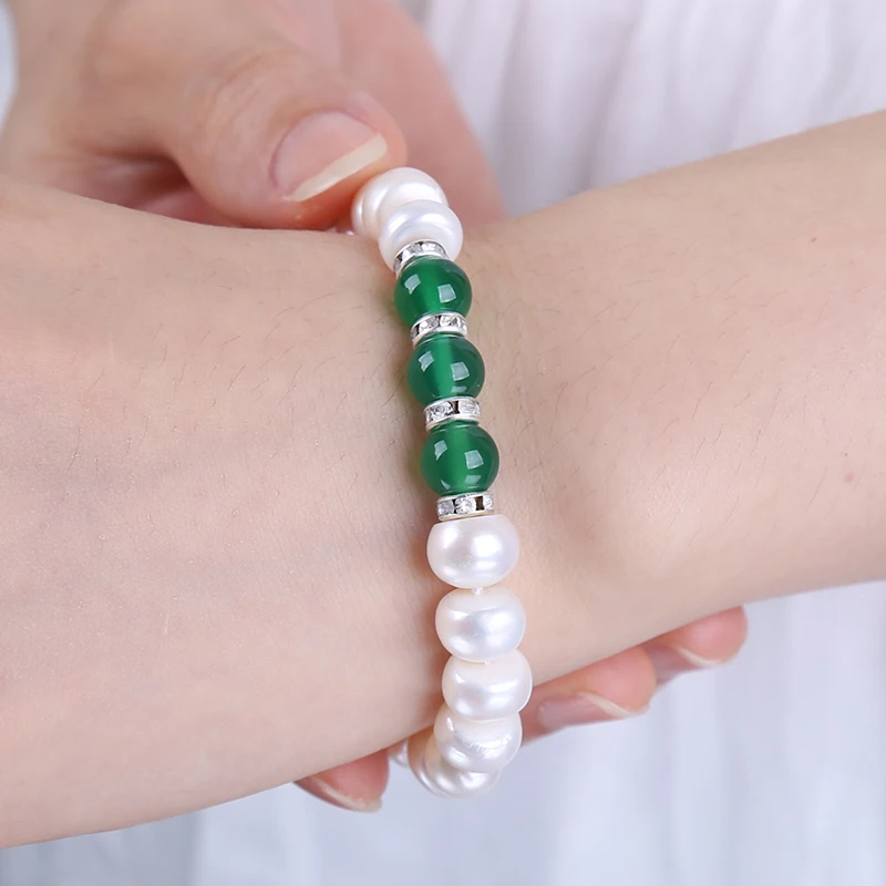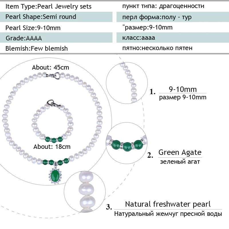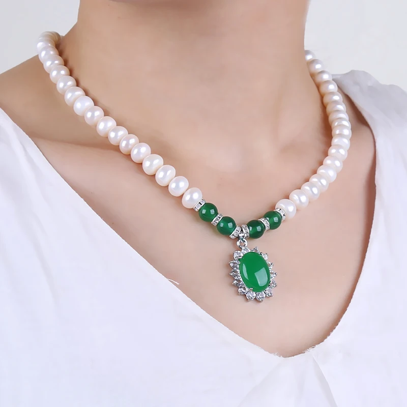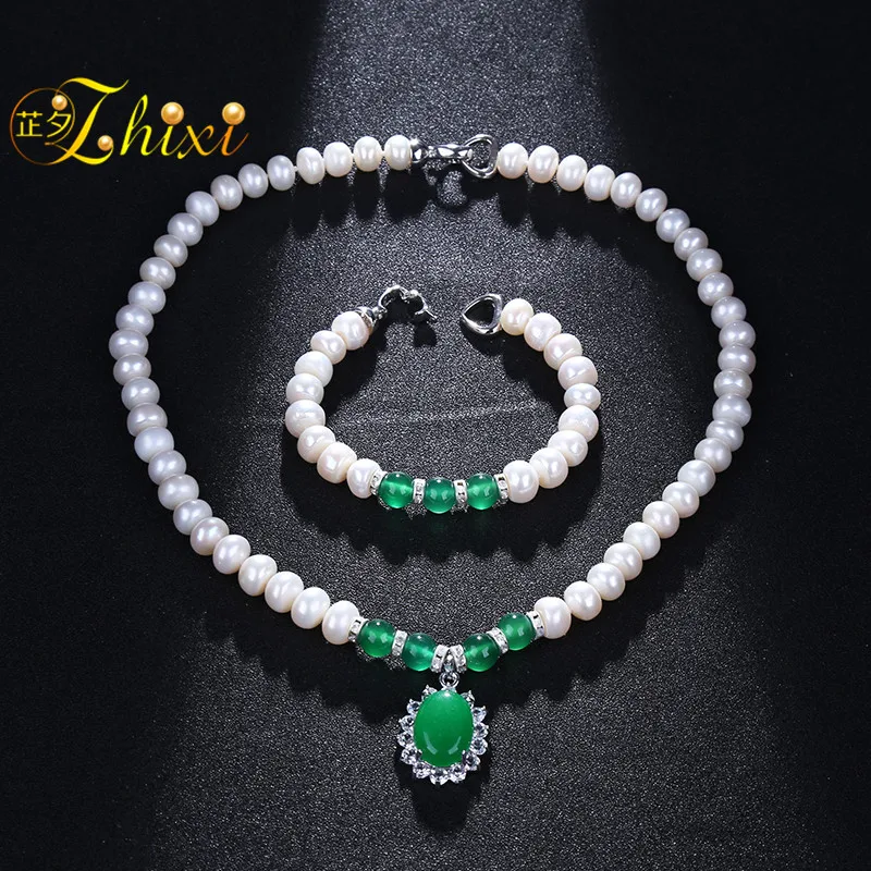 ZHIX Pearl Jewelry Sets Cultured Pearl Necklace Bracelet 9-10mm Natural Stone Choker With Green Jade For Women T222