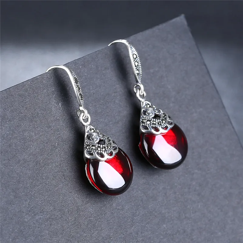 100% 925 Sterling Silver Ruby Drop Earrings for Women Vintage Round Red Stone Earrings Thai Silver Jewelry