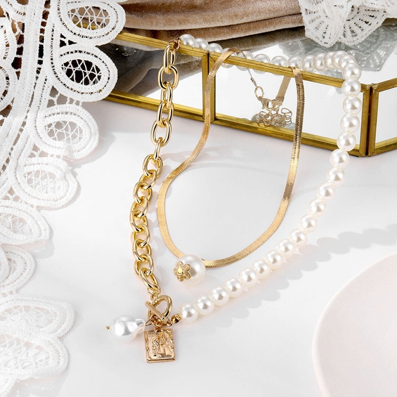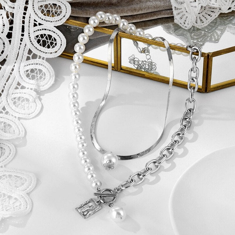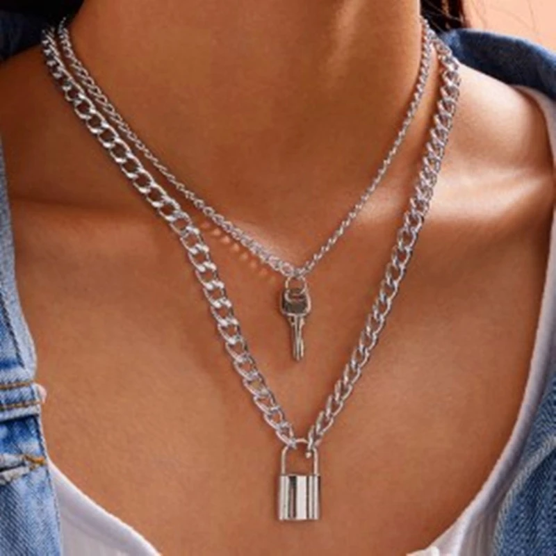 ZOVOLI Layered Punk Chain Necklace Key Lock Pendant Metal Imitation Pearl Necklaces Cuban Link Chain Goth Accessory For Women
