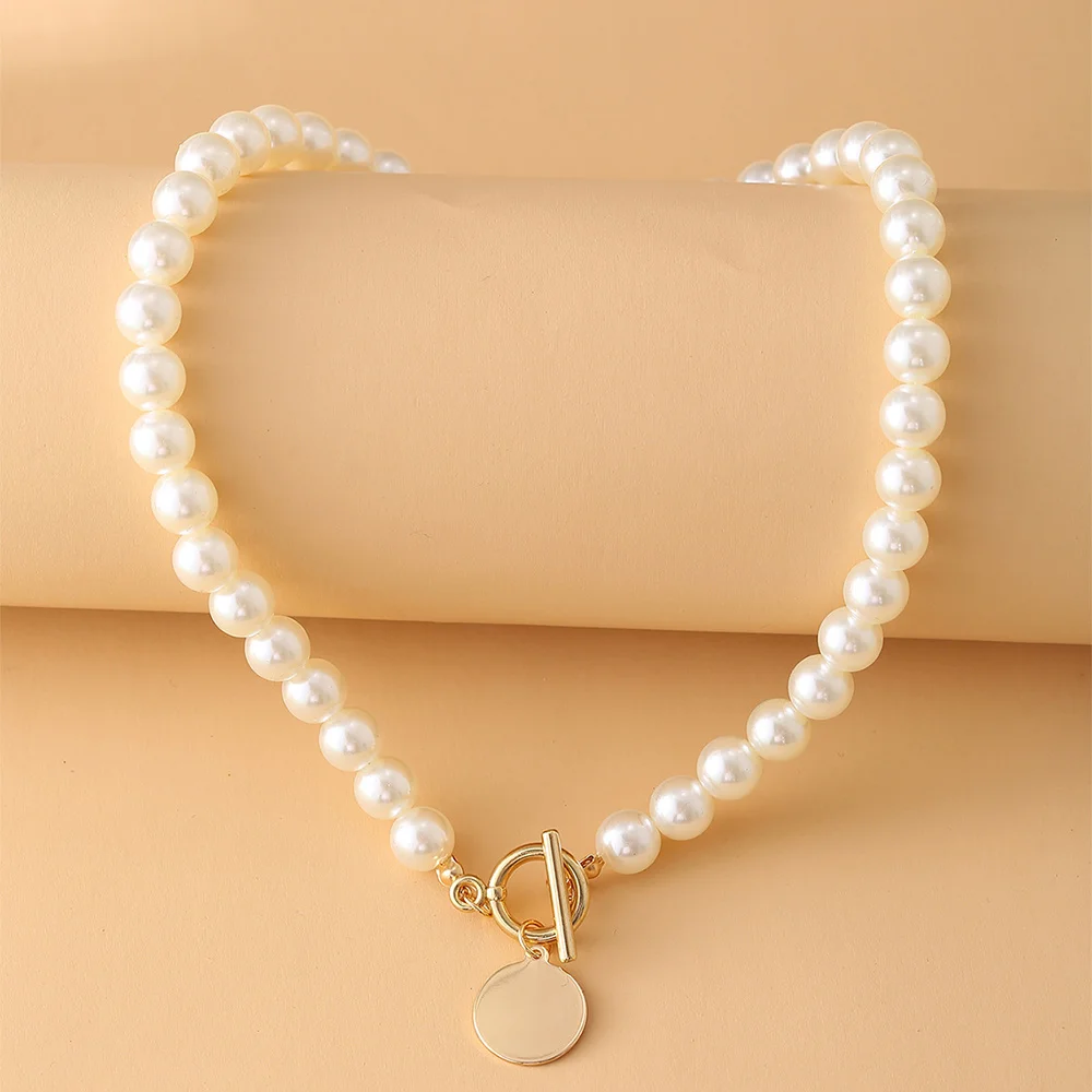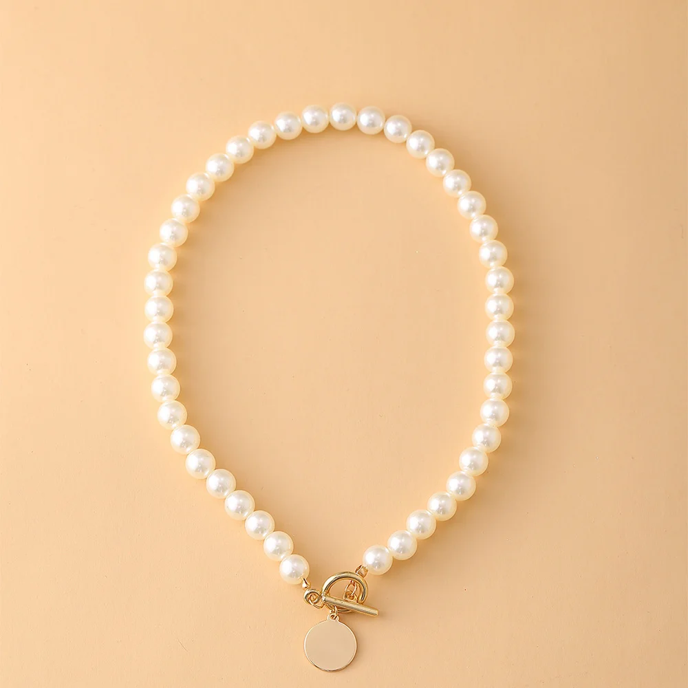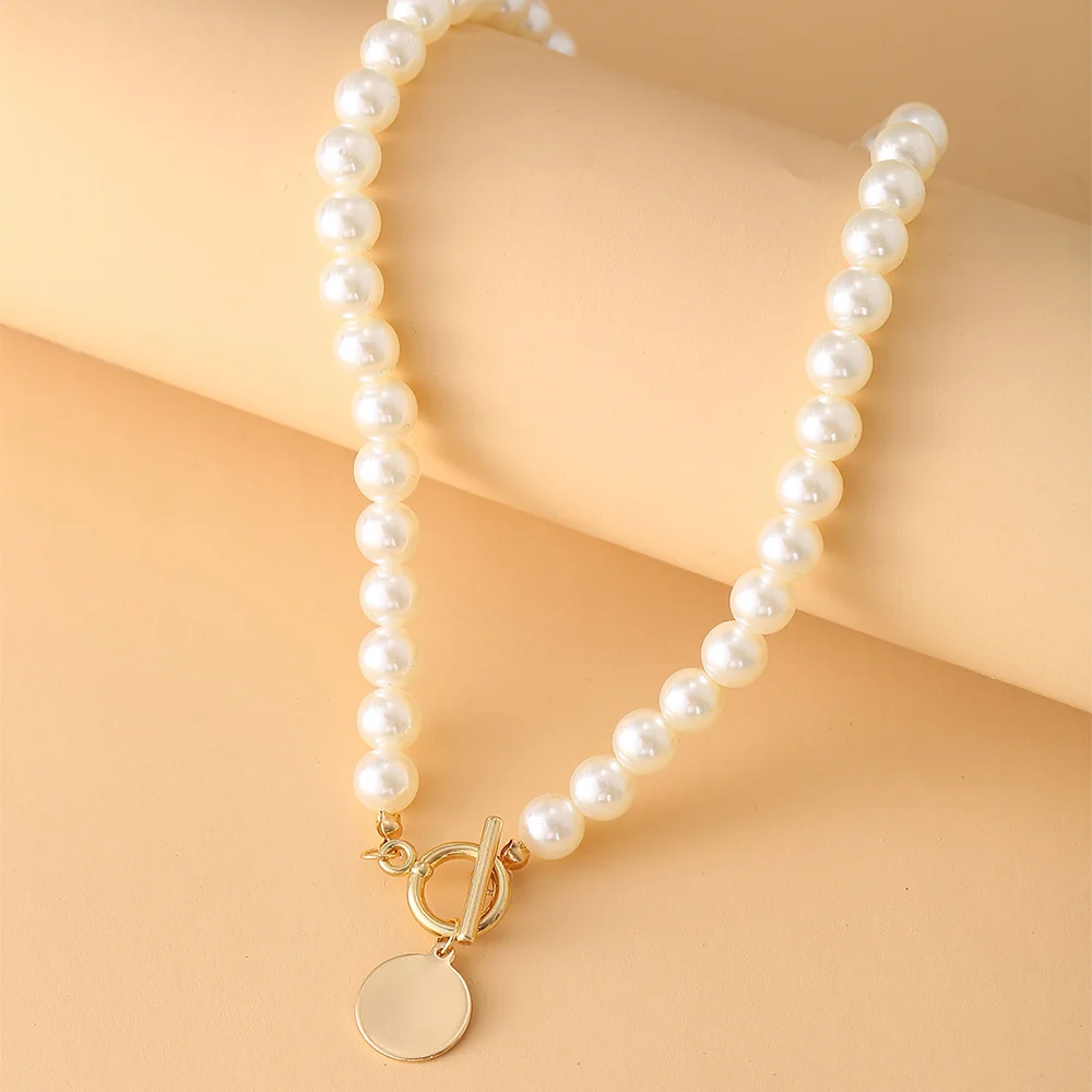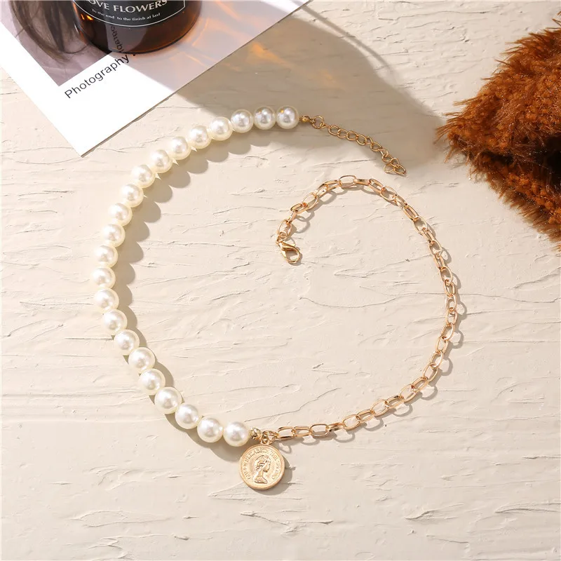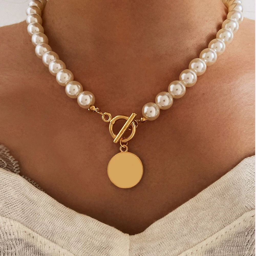 ZYZQ Retro Personality Coin Badge Pendant Necklace for Women Creative Asymmetric Disc Imitation Pearl Necklace Trendy Jewelry